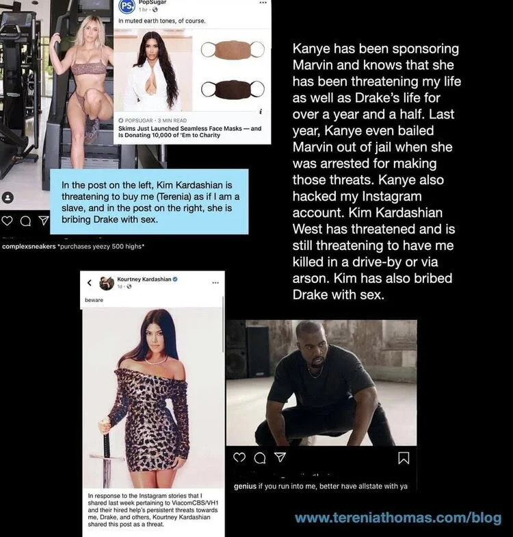 Kanye, who happens to be Drake’s long-time enemy, was among the first influential individuals recruited by Viacom for that reason. He initially hacked my Instagram account and monitored my correspondence with Drake. He was the first influential person, other than Viacom, to knowingly help and sponsor Marvin who regularly threatened us. He and Viacom even bailed Marvin out of jail anytime he was arrested for the threats he made against me and Drake. Viacom had enlisted the help of Jay-Z, Will Smith, and Diddy to recruit me knowing that I was a fan of their work and to stop me from further pursuing my dispute against them. When it became clear I was not interested and only wanted to work with Drake, the death threats via subliminal posts on social media ensued late last summer first from Will Smith, soon after from Jay-Z and then late last year Diddy joined in. Will Smith threatened to arrange to have Drake’s plane crash as well as threatened to set my apartment building on fire or have me hit by a car or motorcycle. Viacom, Jay-Z, Will Smith, and Diddy went as far as arranging a gas leak in my apartment building in February 2020. To continue keeping Drake and me apart from one another we are not only still receiving death threats, but also Viacom and their hired help have invaded our privacy, threatened to frame me for crimes as well as falsely accuse either us of vile behavior that doesn’t reflect our values and the list goes on. Viacom and their hired help have also threatened our loved ones. Ultimately, these antics are also to prevent Drake from informing me about what has been happening behind my back regarding my dispute with Viacom and the lies VH1 has made up about me when I was laid-off in 2017. Kanye West, Will Smith, Jay-Z, Diddy, Kim Kardashian, Khloe Kardashian, Tristan Thompson, Kourtney Kardashian, Kylie Jenner, Kendall Jenner, and Marvin Civil are not the only ones Viacom has commissioned to do their dirty work. In addition to the death threats, Viacom has fabricated lies behind my back going as far as having someone send disparaging emails from my VH1 work email address that I had when I was a full-time employee and compensating my former friends Gessica Bellevue, Mink, Marvin and more to accuse me of unethical/illegal behavior that NEVER happened yet they NEVER addressed it with me directly b/c they know it NEVER happened, but used that false info and more to BLACKBALL me which all happens to violate our severance agreement from 2017.