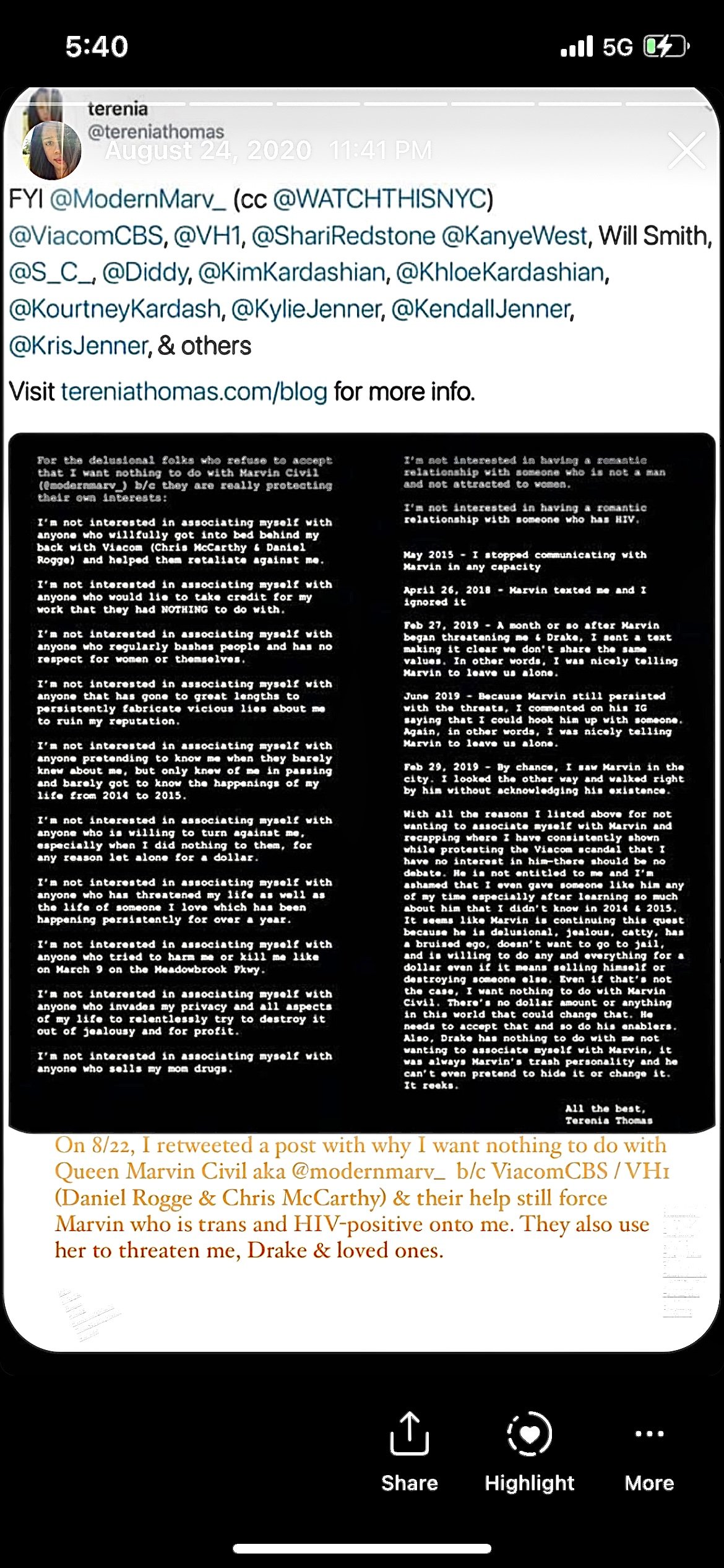 May 2015, I stopped all communication with Marvin because I realized we didn’t have the same values and his personality is trash. This was before I knew Marvin was trans and misrepresenting himself as a straight man, before I knew Marvin was HIV-positive and planned to infect me, before Marvin fabricated viscous lies & accusations about me, before Marvin exaggerated the nature of my association with him now her, before Marvin started committing fraudulent activity on my accounts, before Marvin started invading my privacy and stalking me, before Marvin created and sent me fake eviction notices, before Marvin started threatening Drake, before I found out Marvin was trying to marry me to become a US citizen because he is an illegal immigrant currently on TPS and has threaten to falsify documents and forge my signature on a marriage certificate with the help of my mom if I don’t comply, before Marvin started giving my mom drugs, before Marvin took the opportunity to collude with her pimps at Viacom (Amy, Chris & Daniel) who have been plotting to destroy my life simply because I spoke up for myself, before Marvin was threatening to rape and kill me, before Marvin attempted to murder me, and much more which I only found out about last year and this year. Marvin Civil would not even be on my radar now if it wasn’t for Amy Campbell, SVP of Brand Creative for MTV, VH1, Logo, Daniel Rogge, executive producer for VH1, and Chris McCarthy, president of Viacom’s entertainment & youth group who oversees VH1, MTV, Comedy Central, Paramount Network, CMT, TV Land & more, recruiting Marvin for the sole purpose of terrorizing me and then Drake. Marvin even texted me in April 2018 and I ignored it because I wanted to do with her. In early 2019, I found out about Marvin threatening Drake and me. I reached out to Marvin to try to get her to stop the threats. Marvin read my texts but clearly wasn’t interested in making peace since she continues to terrorize Drake and me to this day. If Marvin didn’t get it since 2015 when I stopped communicating with her, April 2018 when I ignored Marvin’s text, February 2019 when I sent Marvin the text below breaking down why I want nothing to do with her, February 2020 when I ignored Marvin when I walked passed her in the city, and every other CLEAR message of my disinterest in Marvin but she sill doesn’t get that now than that proves she is in dire need of and overdue for psychiatric help along with her pimps who are using Marvin like a rabid dog to attack Drake and me to protect their interests. I cannot stress enough how Drake had nothing to do with my disinterest in Marvin, Marvin’s trash personality did and she just can’t accept that and wants to blame someone for anything that doesn’t go her way. Even if Marvin was the last person on earth, I would rather enjoy my solitude. Regardless, it is solely up to me who I want to associate myself with - no one else.
